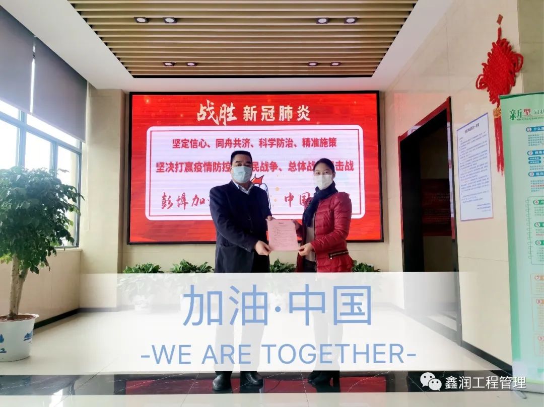 2月21日下午,浙江鑫潤工程管理有限公司副總經(jīng)理王承仙與彭埠街道辦事處副主任沈澤民簽署了十萬元的定向捐贈(zèng)協(xié)議,愛心款將全部用于彭埠街道新冠肺炎疫情防控工作!