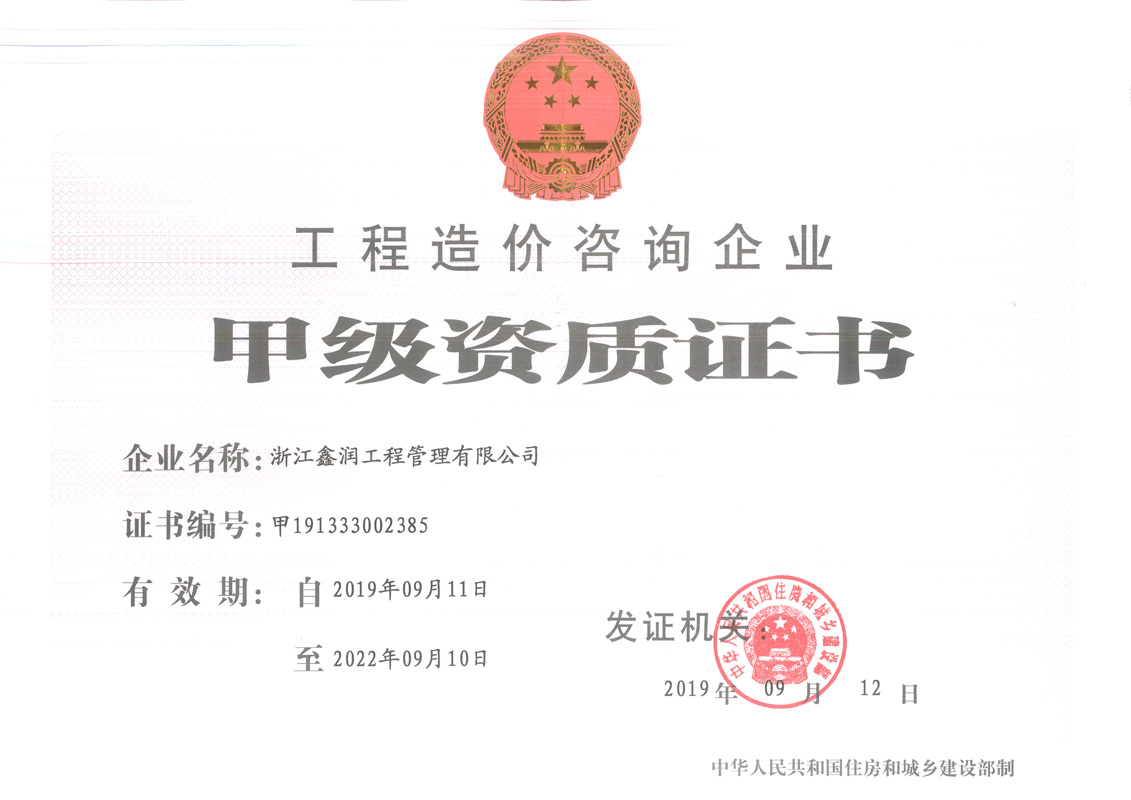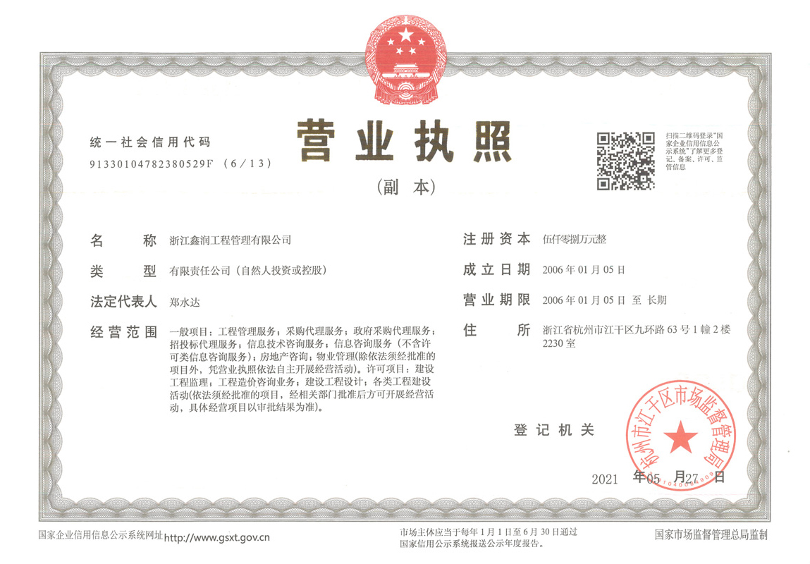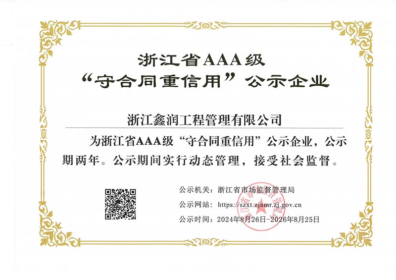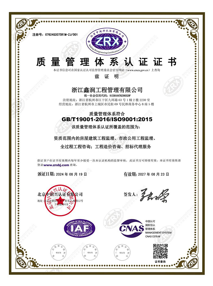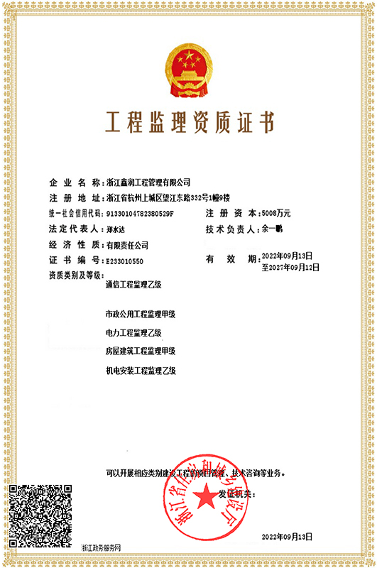 浙江鑫潤工程管理有限公司成立于2006年,經過多年的不斷開拓進取,現已發展成為一家涵蓋工程監理、招標代理、造價咨詢、工程設計等專業領域綜合實力雄厚的全過程工程咨詢服務企業。具有建設部頒發的房屋建筑工程監理甲級資質、市政公用工程監理甲級資質、工程造價咨詢甲級資質、招標代理甲級資質及工程設計、景觀設計、工程施工、工程咨詢、人民防空、機電安裝、物業管理等相關資質。