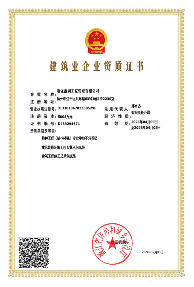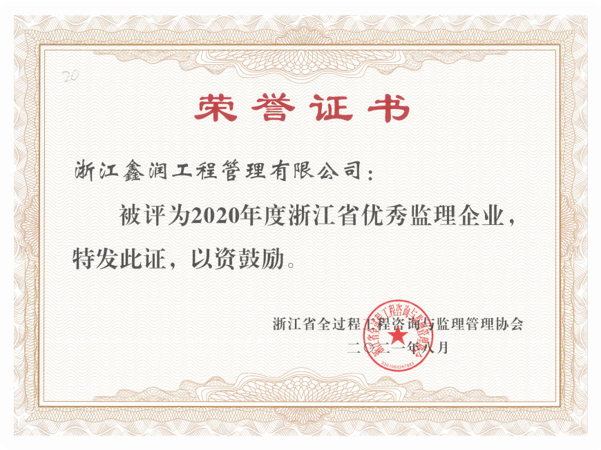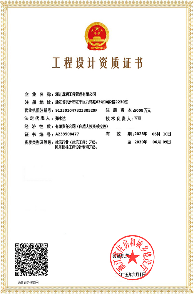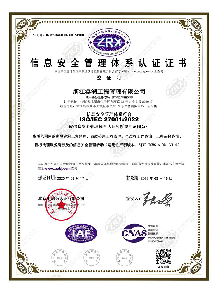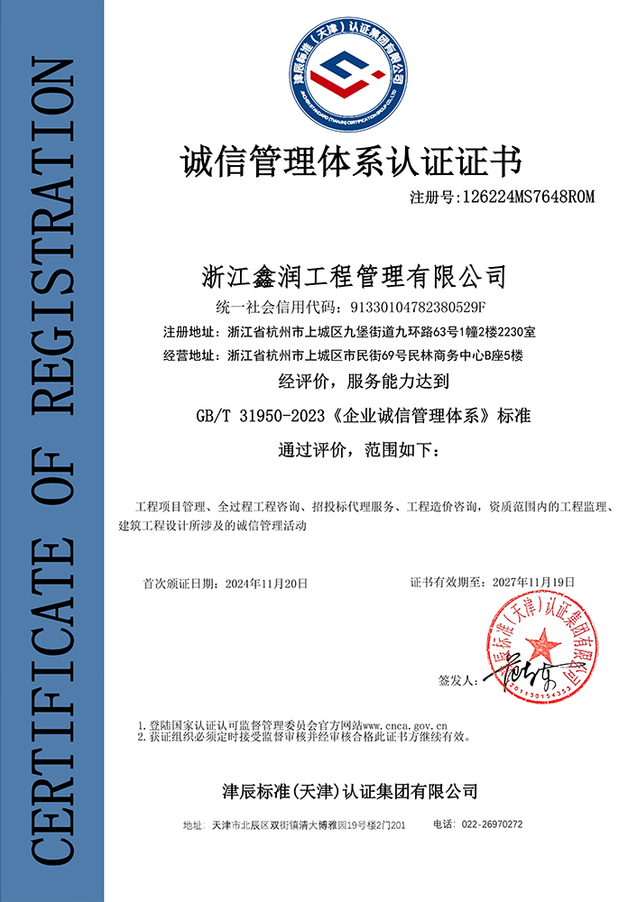 浙江鑫潤工程管理有限公司成立于2006年,經過多年的不斷開拓進取,現已發展成為一家涵蓋工程監理、招標代理、造價咨詢、工程設計等專業領域綜合實力雄厚的全過程工程咨詢服務企業。具有建設部頒發的房屋建筑工程監理甲級資質、市政公用工程監理甲級資質、工程造價咨詢甲級資質、招標代理甲級資質及工程設計、景觀設計、工程施工、工程咨詢、人民防空、機電安裝、物業管理等相關資質。
